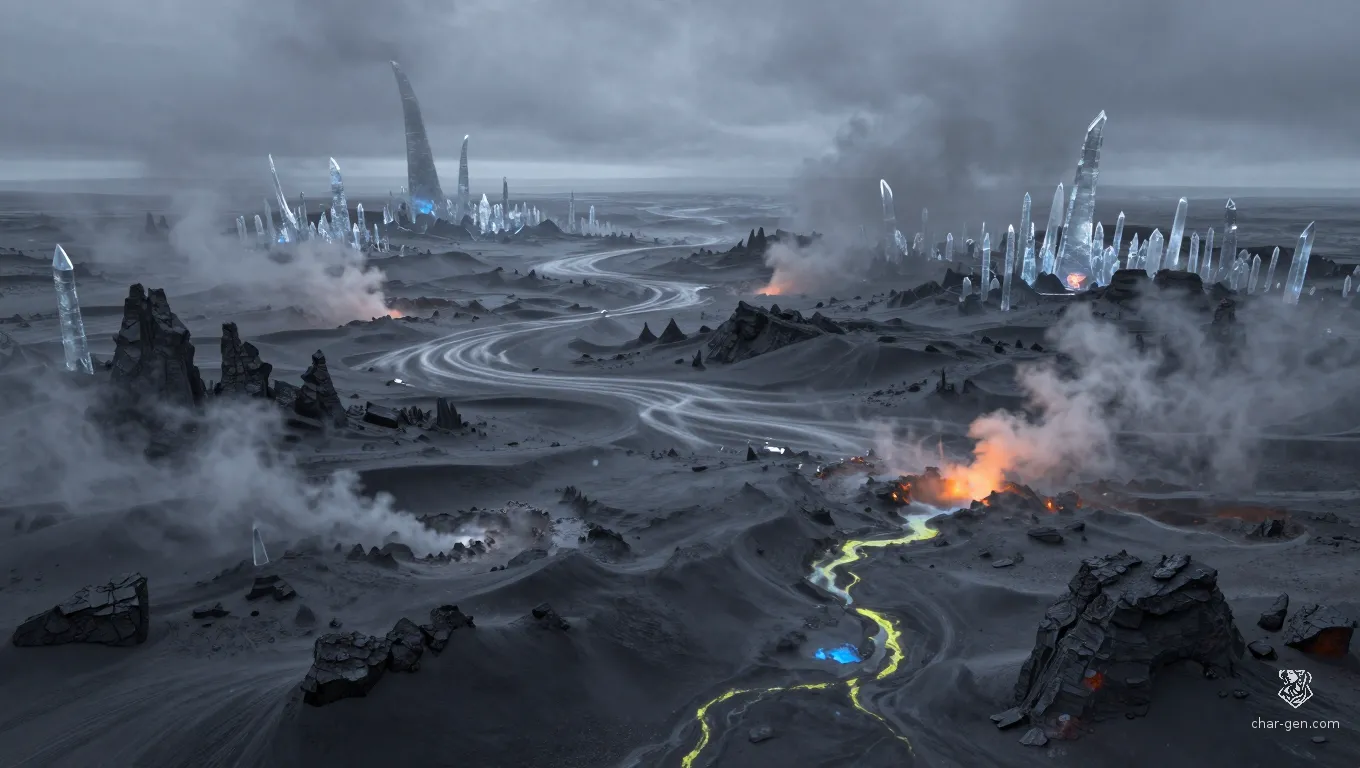 The transition from the lush valleys of the interior to the 'Outskirts' is marked by a sudden, chilling silence. Here, the air turns heavy with volcanic soot, a fine grey powder that clings to clothes and clogs the throat. Tall, skeletal trees stand as silent sentinels in a landscape of rolling ash-dunes and jagged obsidian outcrops. The horizon is perpetually lost in a dense, sulfurous fog that smells of old smithies and forgotten graves. Survival in this fringe territory requires more than just steel; it requires an eye for the subtle shifts in the wind and the knowledge of where the earth is hollow. Abandoned supply wagons, half-buried in the shifting grit, serve as grim milestones for those foolish enough to stray from the few beaten paths. Somewhere in the gloom, a rhythmic scraping sound suggests that the local predators are not just hunting, but sharpening their claws against the very bedrock of the world.