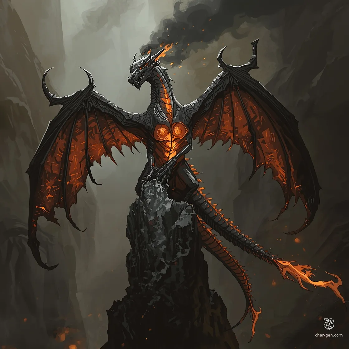 A territorial, soot-covered dragon that manipulates smoke and fog to hunt travelers in the charred outskirts.