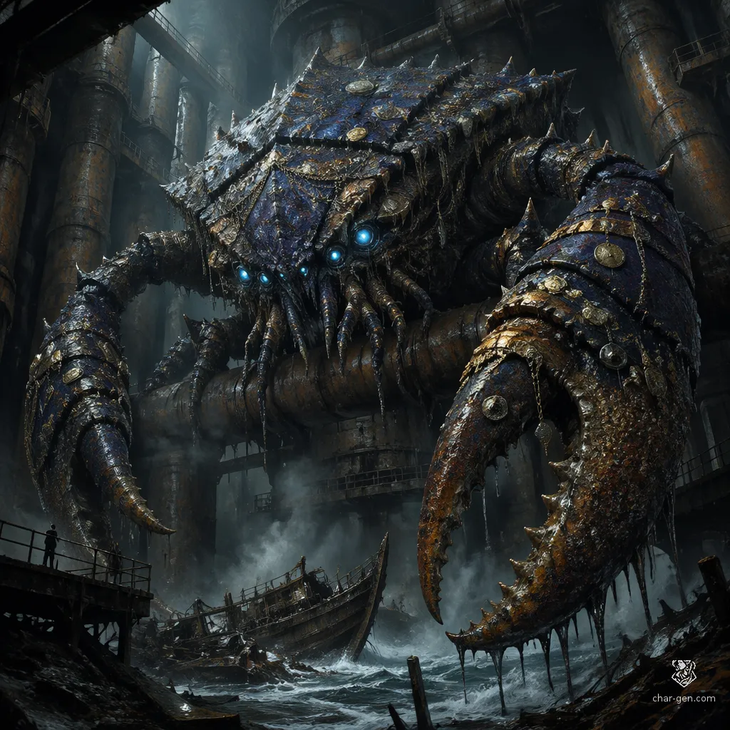 A gargantuan, salt-encrusted lobster mutated by alchemical runoff and mechanical sludge, acting as the apex predator of a decaying desalination plant.