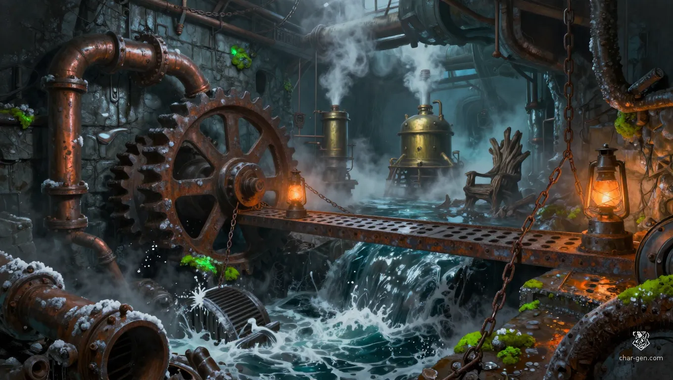 The air in the Sluice is a thick soup of salt-spray and the stench of decaying kelp. Every step onto the slime-slicked flagstones is a gamble against gravity, while the distant rhythm of the crashing surf echoes through the ventilation shafts like the heartbeat of a drowning god. The stone walls weep with black seawater, and the persistent scratching of thousands of tiny claws behind the masonry keeps the nerves of even the hardiest sailors on edge. What was once a sophisticated series of channels for filtering sea salt has been reclaimed by the ocean’s most wretched denizens. Rusted iron portcullises hang precariously, held by chains half-eaten by corrosion. Deep within the lower chambers, the tide is rising, and with it come the things that belong in the dark, lightless trenches of the deep, now seeking sanctuary in these forgotten, grimy corridors.
