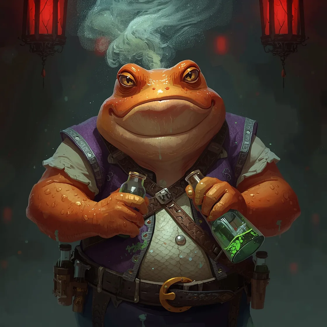 Tok-Tok is a creature of high-strung anxiety and commercial opportunism. He is fawningly polite to anyone carrying a bag of sea salt but becomes irritable and snapping if he feels his skin starting to dry. He is incredibly generous with trade information to those who respect his amphibious needs, yet he is known to be ruthlessly miserly when negotiating the price of Dragon Spit with the local addicts. He fluctuates between extreme confidence in his chemical mixtures and a crushing fear that the city air is slowly killing him.