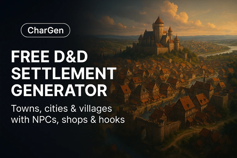 Settlements are the heartbeat of fantasy campaigns. With our D&D settlement generator, you can rapidly create living locations with their own identities: districts, landmarks, factions, notable NPCs, and story hooks. Use it to spin up a sleepy fishing village, a bustling trade city, or a mountain monastery—each with distinct culture, economy, and conflicts.
