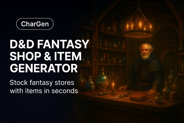 Looking for a fast dnd shop generator or all-purpose fantasy shop generator? CharGen acts as your medieval shop creator and rpg merchant generator, producing balanced fantasy store inventory for any settlement—from village stalls to bustling dnd marketplace generator hubs.